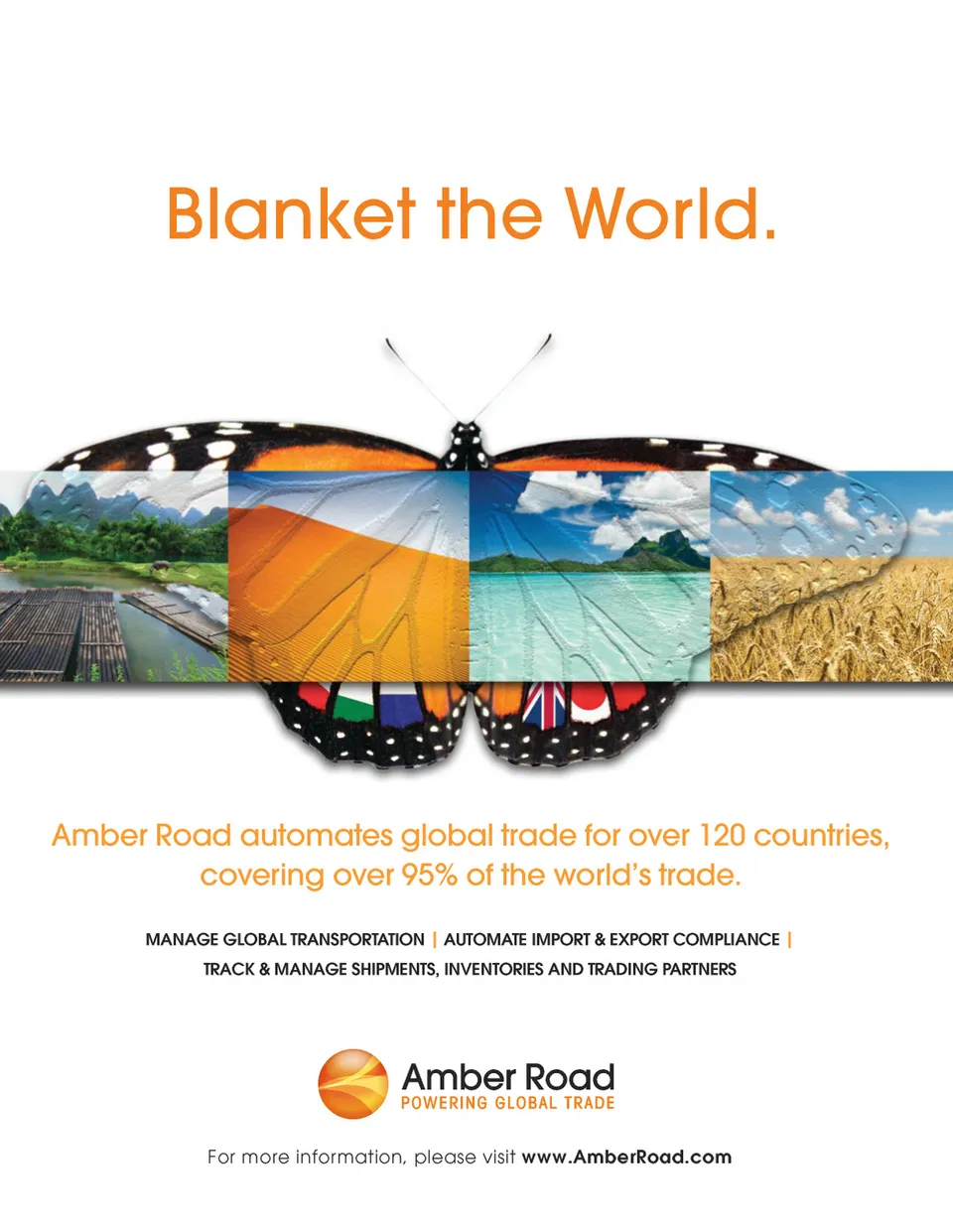 Blanket the World. AMBER ROAD Amber Road automates global trade for over 120 countries, covering over 95% of the world’s trade. MANAGE GLOBAL TRANSPORTATION | AUTOMATE IMPORT & EXPORT COMPLIANCE | TRACK & MANAGE SHIPMENTS, INVENTORIES AND TRADING PARTNERS For more information, please visit www.AmberRoad.com