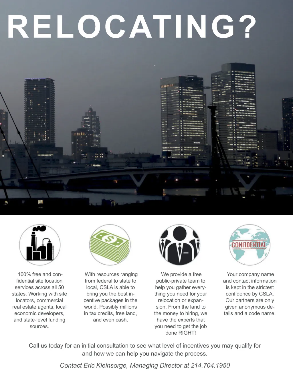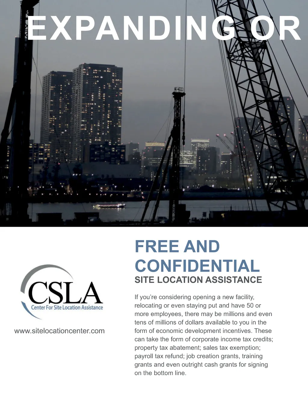EXPANDING OR FREE AND CONFIDENTIAL SITE LOCATION ASSISTANCE If you’re considering opening a new facility, relocating or even staying put and have 50 or more employees, there may be millions and even tens of millions of dollars available to you in the form of economic development incentives. These can take the form of corporate income tax credits; property tax abatement; sales tax exemption; payroll tax refund; job creation grants, training grants and even outright cash grants for signing on the bottom line. www.sitelocationcenter.com